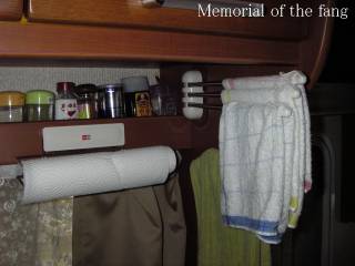 「棚にポール」 温泉巡りが好きなのでフリールーム内だけではタオルを干すのに足りません。 そこでダイネット上の棚にポールを設置しました。 濡れた物を干すので木製ではカビが発生する可能性があります。 そこで室内の雰囲気を壊さないように木目調ステンレスパイプを選びました。 干す目的でなくとも冬場は乾燥しますので、濡れたタオルをかけて置けば室内の乾燥を防げます。 またそれなりの強度がありますので工夫次第でいろんなことに利用できそうです。 便利のためにはガンガン穴をあけてしまう今日この頃です。(爆) |